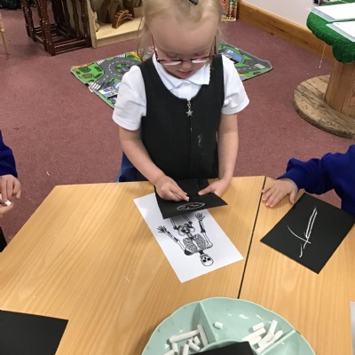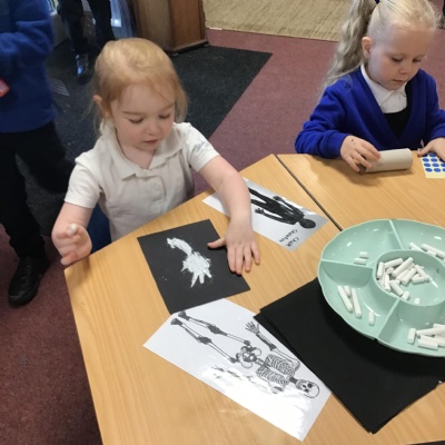 Following on from the children's interest we have started to experiment with what our bodies might be made up of. We have been looking at skeletons and thinking about all our different bones we have inside out bodies. The children have also been thinking about size and how we are all different sizes to each other.