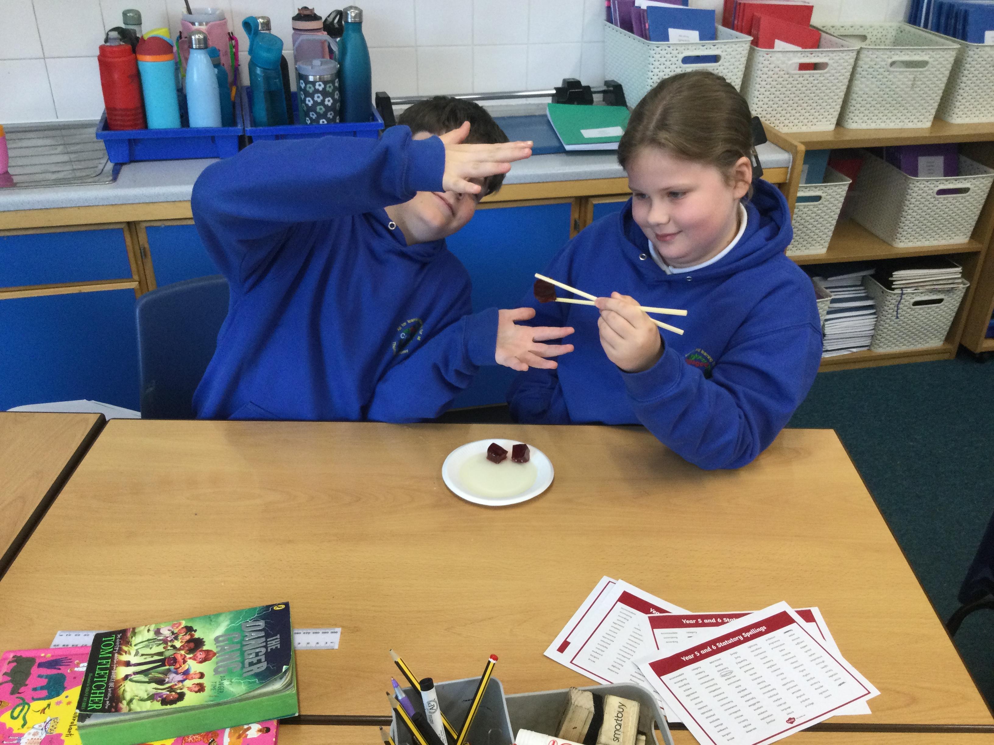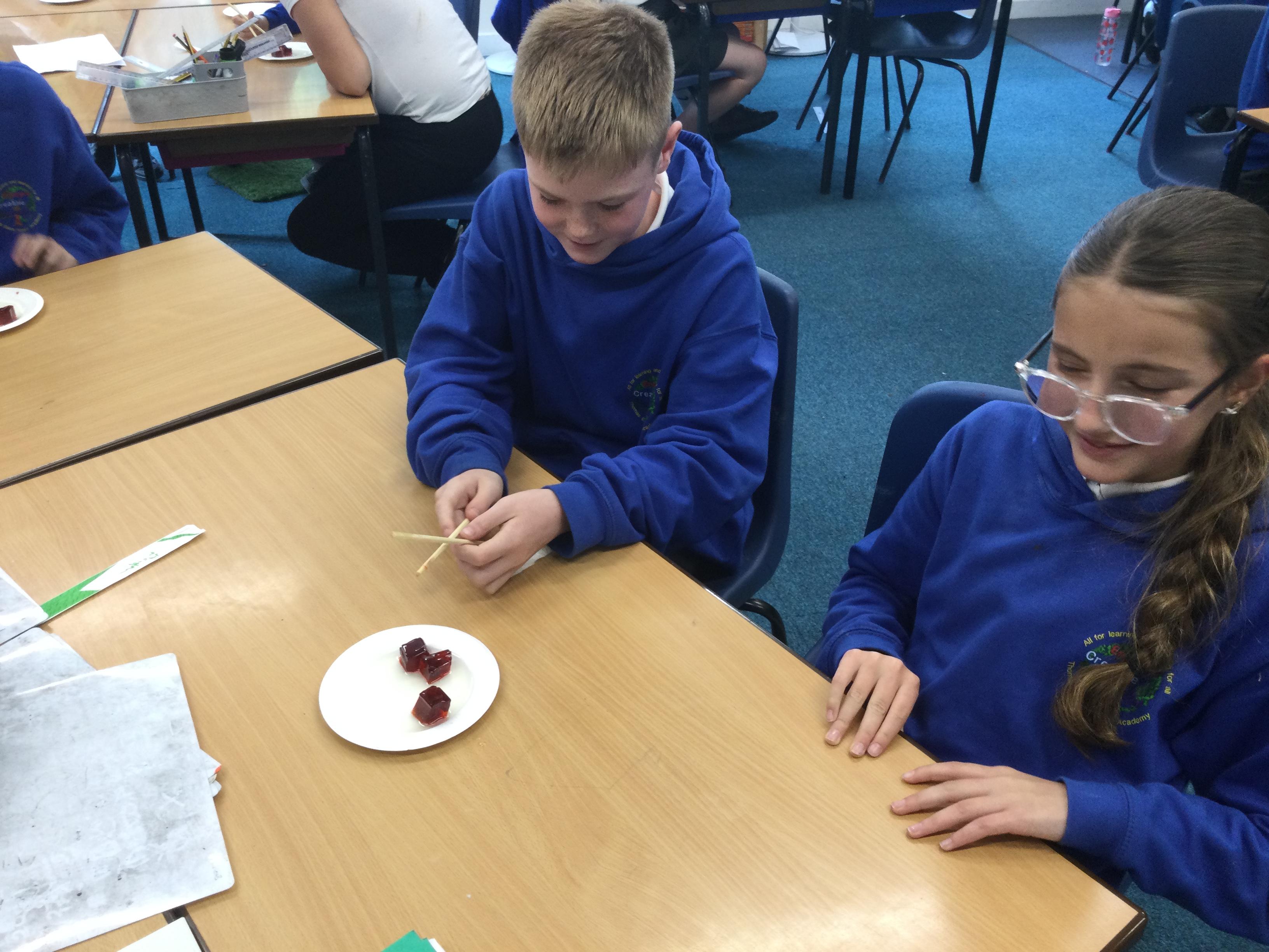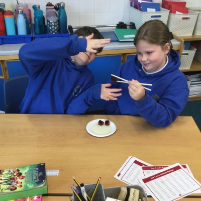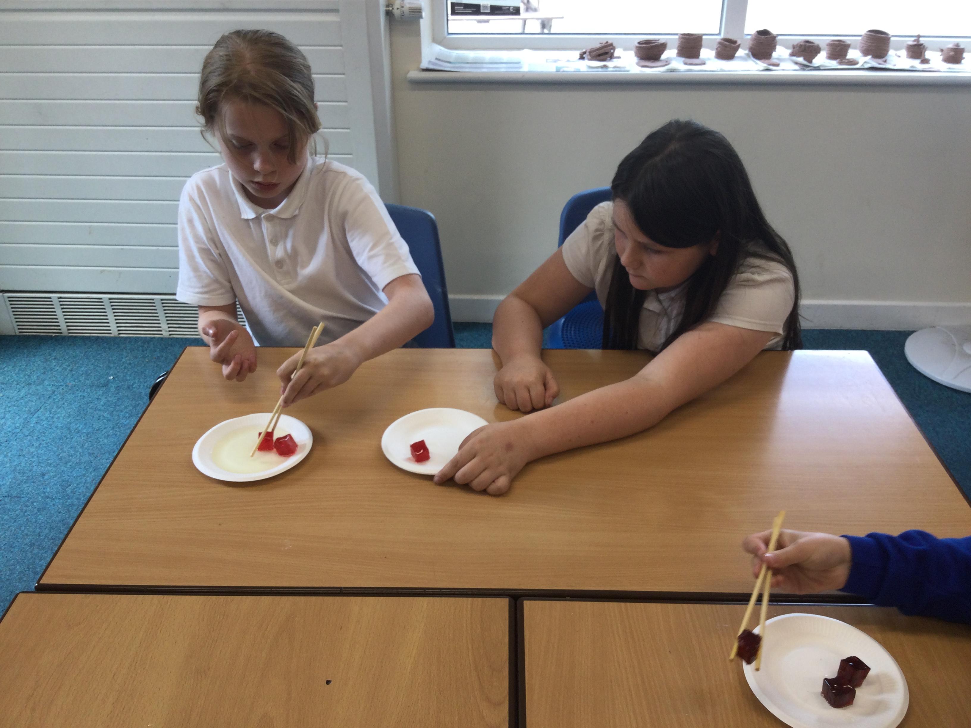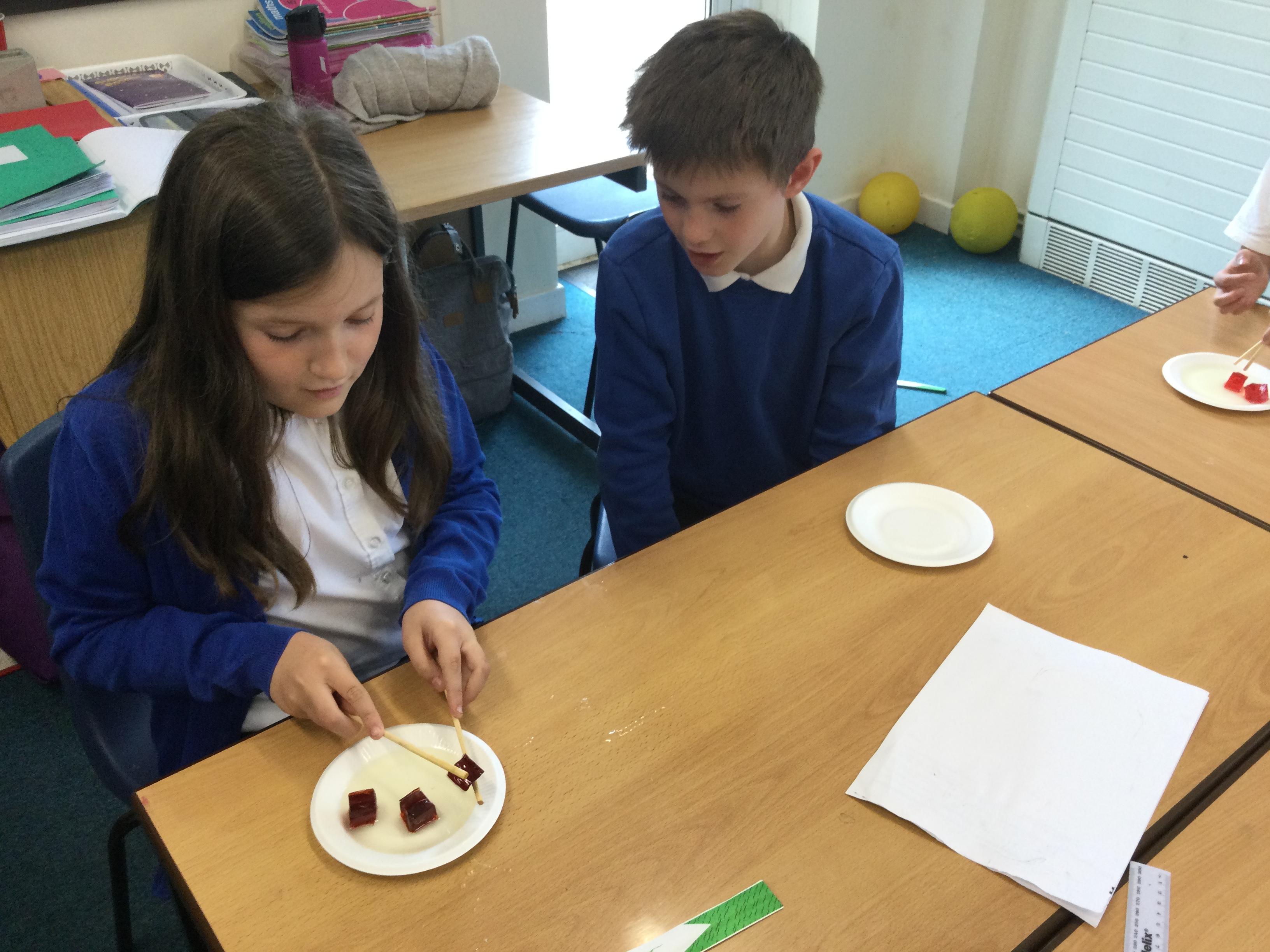 In science this term we are exploring forces. In our first lesson we reminded ourselves that friction is a force. After identifying instances in sports where friction is increased or decreased as much as possible, we undertook an experiment. Our equipment was simply a pair of chopsticks and some cubes of jelly. We started by picking the jelly cubes up with the chopsticks - we were successful because we identified there was a lot of friction. We decided to reduce this adding cooking oil and repeating the test!