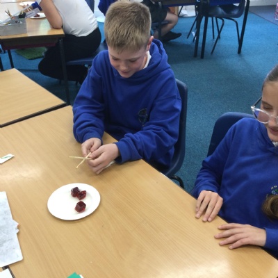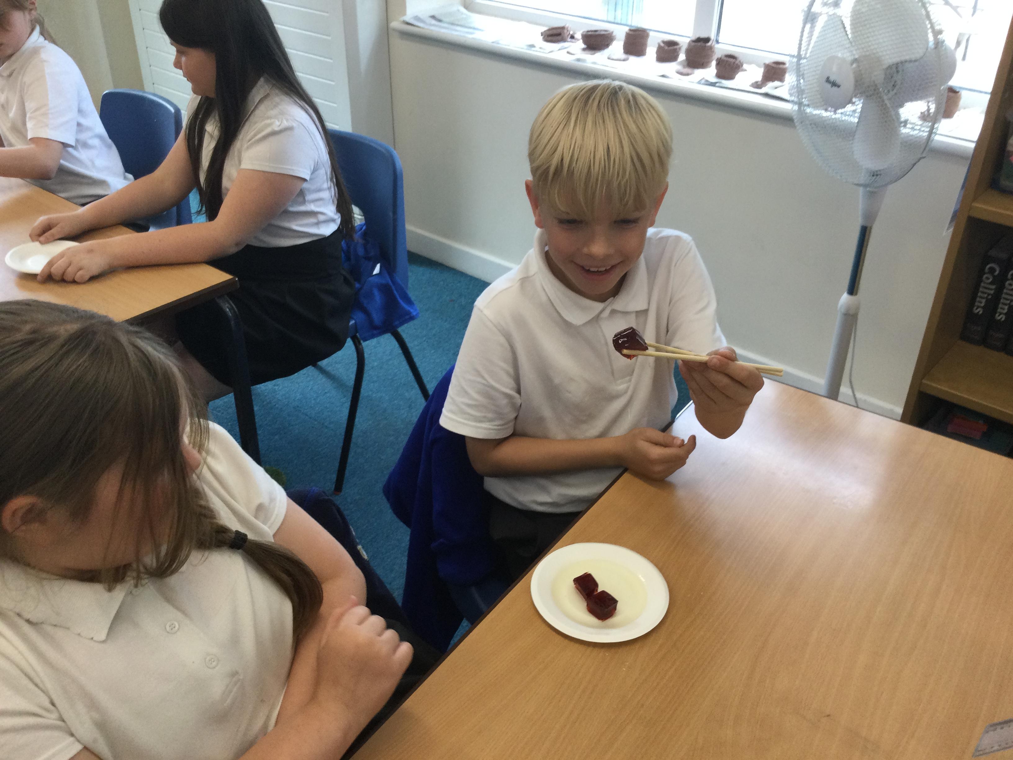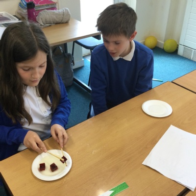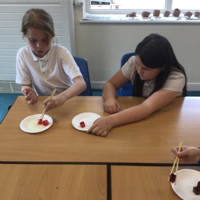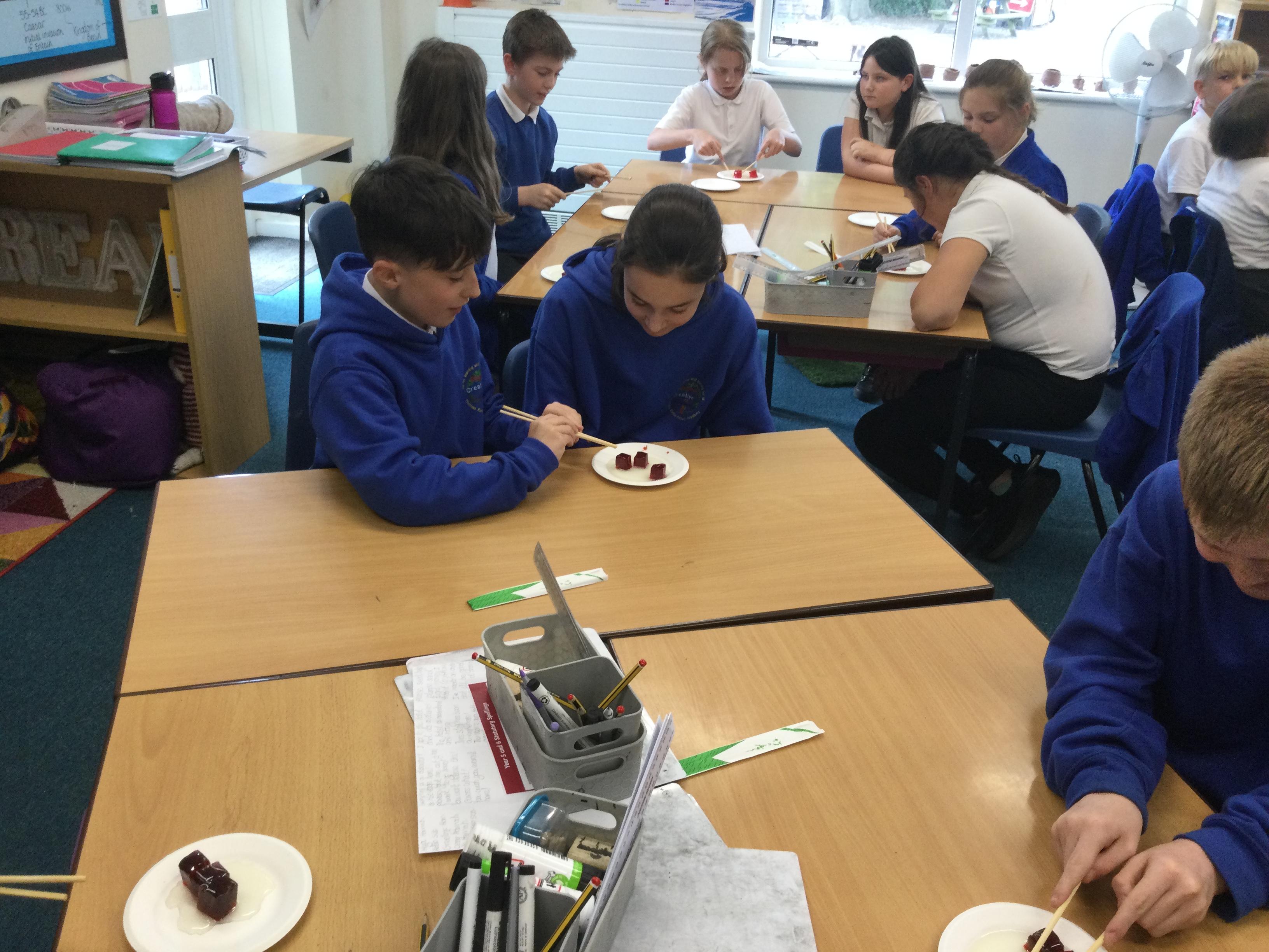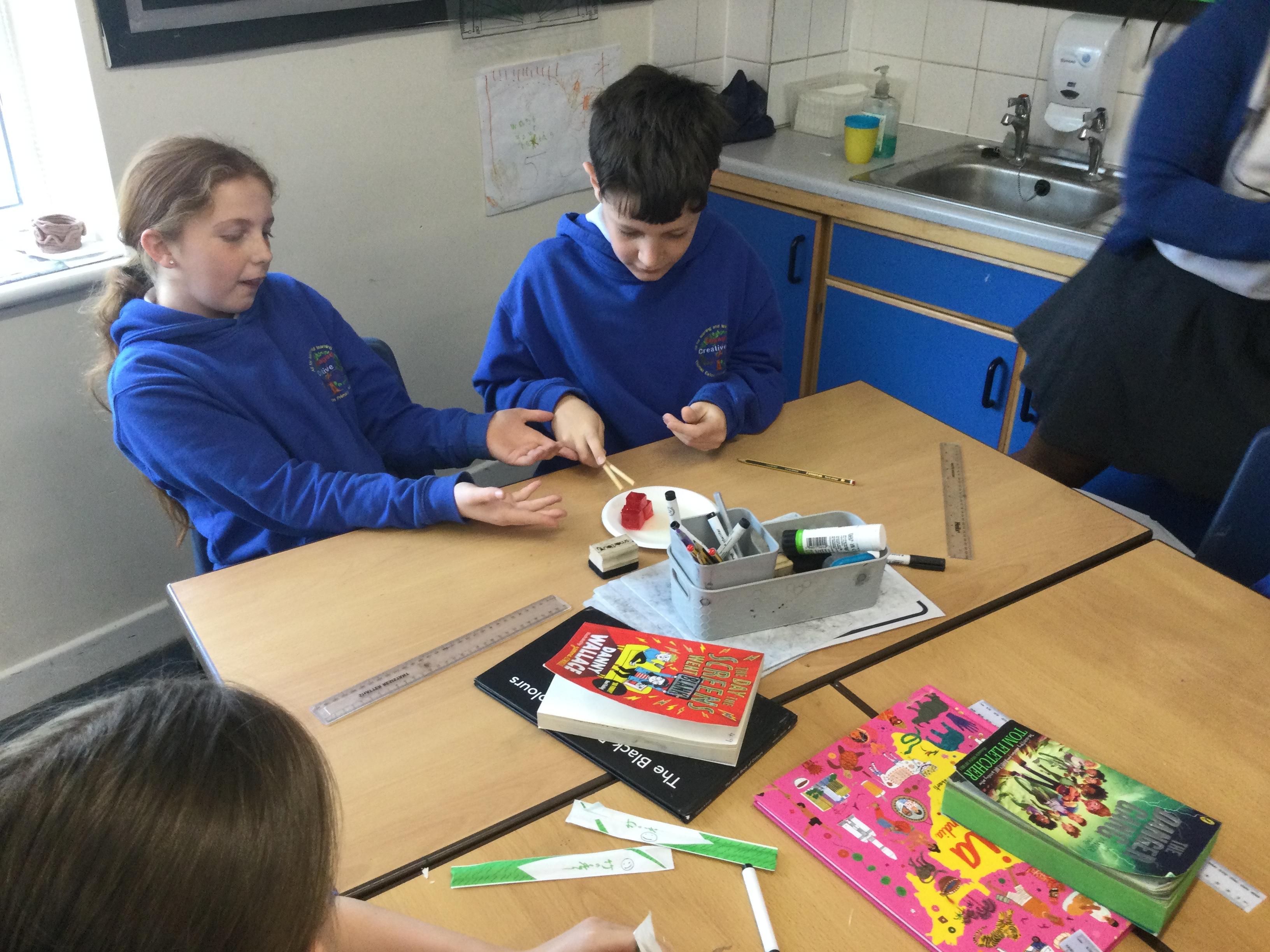 In science this term we are exploring forces. In our first lesson we reminded ourselves that friction is a force. After identifying instances in sports where friction is increased or decreased as much as possible, we undertook an experiment. Our equipment was simply a pair of chopsticks and some cubes of jelly. We started by picking the jelly cubes up with the chopsticks - we were successful because we identified there was a lot of friction. We decided to reduce this adding cooking oil and repeating the test!